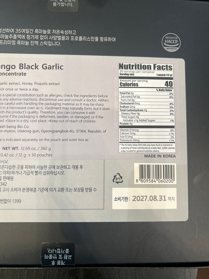 국내 최대 마늘 주산지인 **경북 의성산 마늘 100%**로 저온숙성시켜 만든 프리미엄 흑마늘 스틱이 재입고되었습니다. 0.42oz/12gx30 pouches